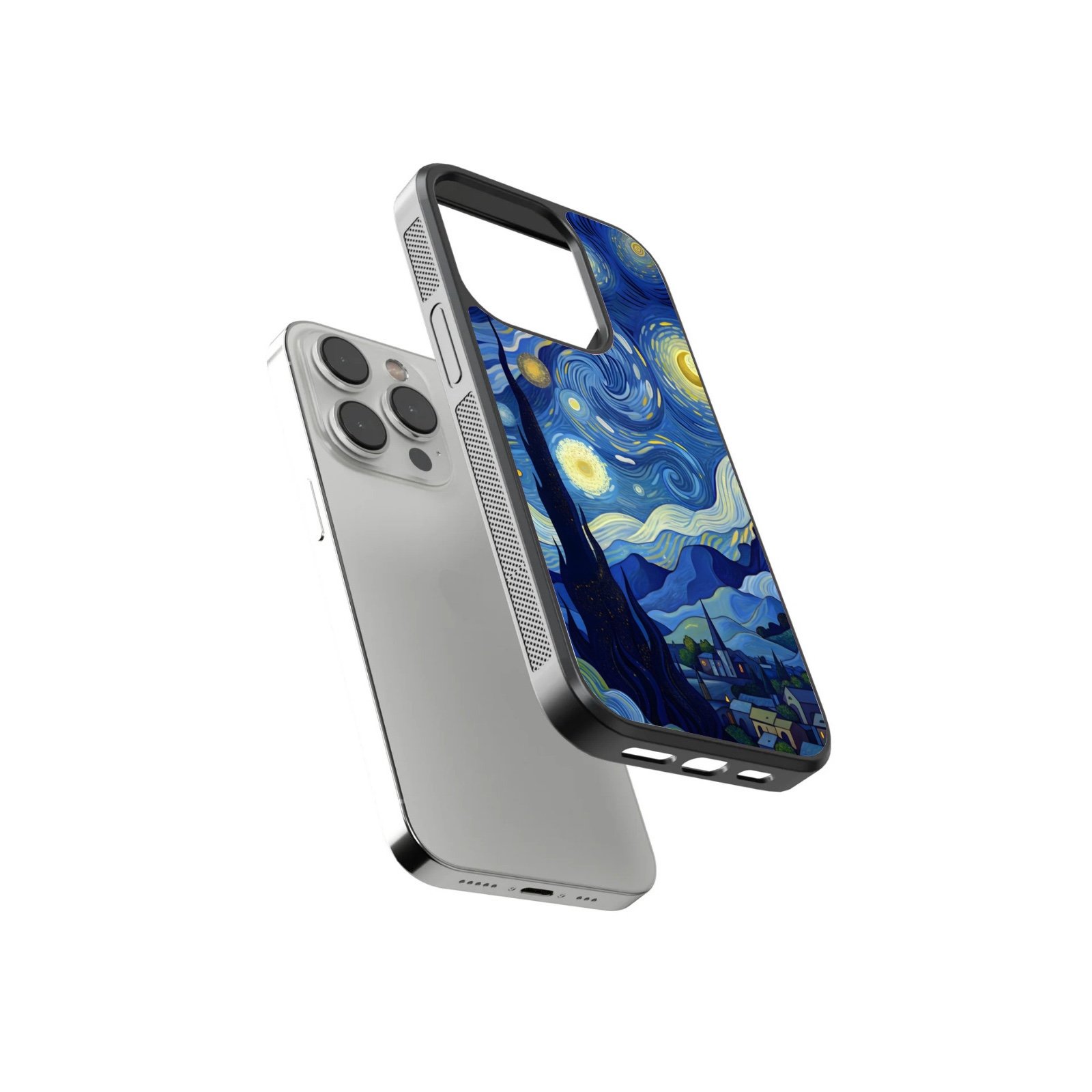 Artistic starry night–inspired design with swirling skies and village scenery